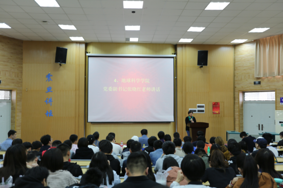 地球科学学院党委副书记张晓红讲话。她表示,学校的院系专业调整是顺势而为,希望各位师生能够理解,同时,要更加理性地看待新学院的组建。