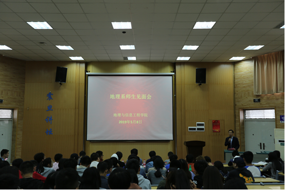 党委书记许德华,院长王绍强,副书记武彦斌,副院长刘修国、关庆锋、潘雄,院长助理尚建嘎、王伦澈;地球科学学院党委副书记张晓红;公共管理学院党委副书记刘国华;以及三个学院的部分老师和地理系全体学生参加了此次会议。