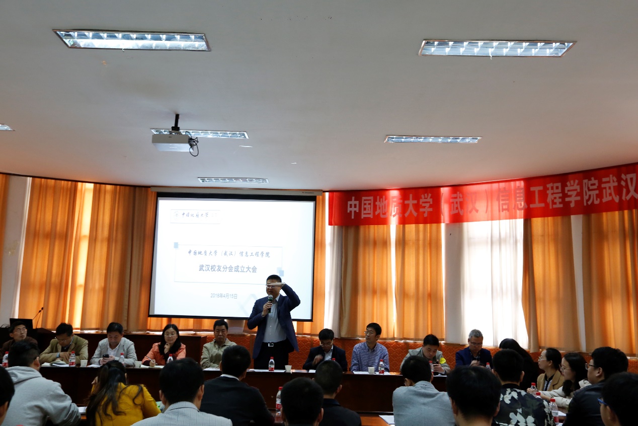 (武汉)校友与社会合作处处长徐岩代表学校向信息工程学院武汉校友分会的成立表示热烈的祝贺,对武汉校友给予学校的关心和支持表示感谢。他着重强调校友是母校最宝贵的社会资源,向校友们传达了学校对待校友间交流的理念,“信息互通,资源互融,利益共享”,坚定地表示学校会对校友提供尽可能的支持与帮助,也希望各校友分会共谋地大发展,为学校学子的未来助力。
