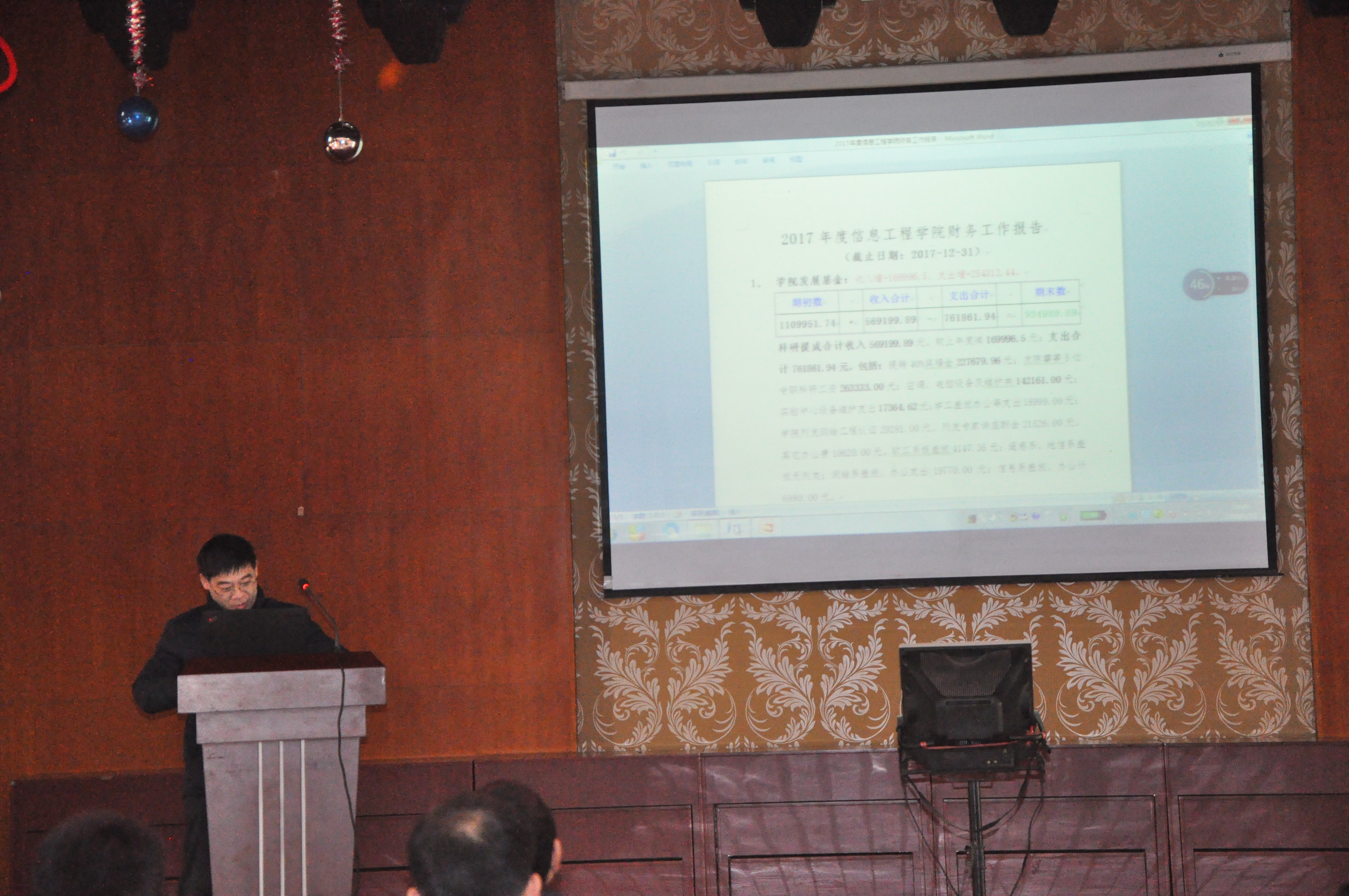 随后,由副院长刘修国教授做学院年度财经工作报告。刘院长向全体教职工准确地公布了学院一年来的经费使用、支出以及结余各项数据。