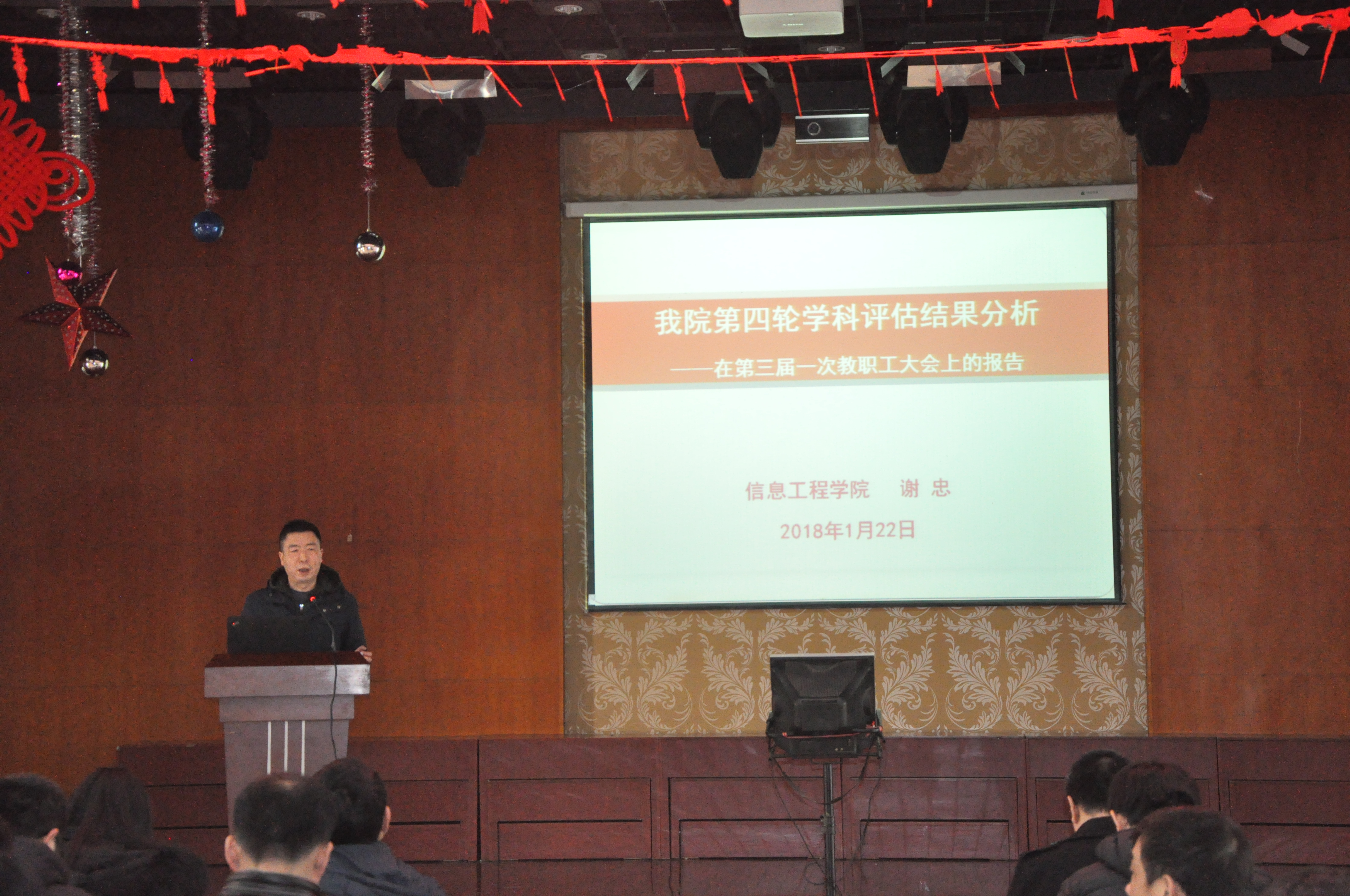 2018年1月23日下午14时,信息工程学院在校工会一楼教工活动中心召开2017年教职工大会。全院教职工参会,由副书记许德华主持,大会的主要任务是审议院长工作报告、学院财经工作报告和工会年度工作报告。