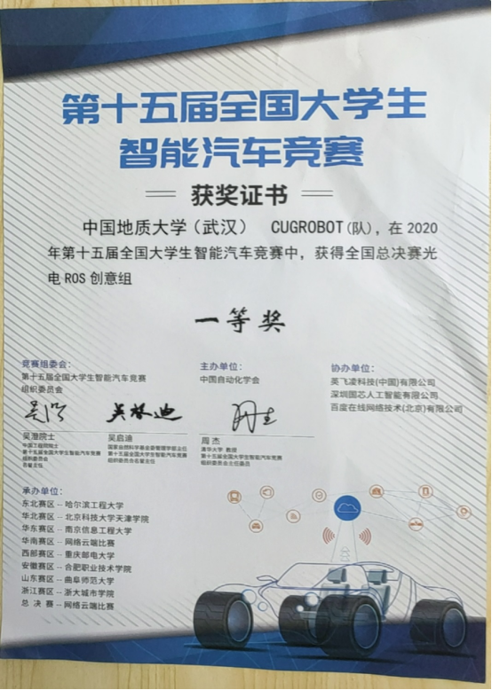 学生组成的CUGROBOT团队(队员:莫惠南、江严钊、舒鹏杰、郑剑宇、李子宇,指导老师:罗忠文、刘袁缘)参加了创意ROS组的全国总决赛,获得全国一等奖。