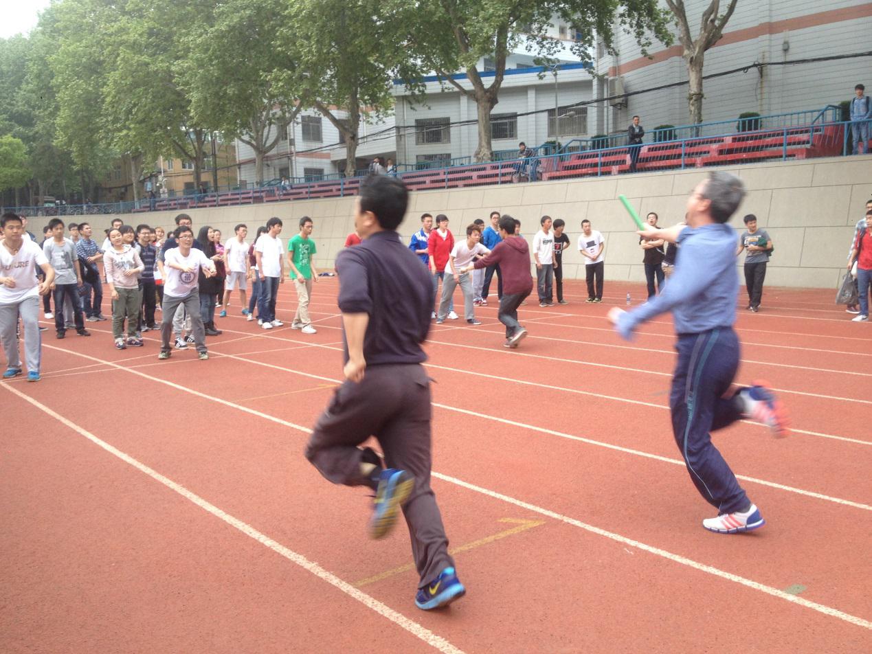 图为50米男女混合往返接力,党委副书记许德华老师参赛中
