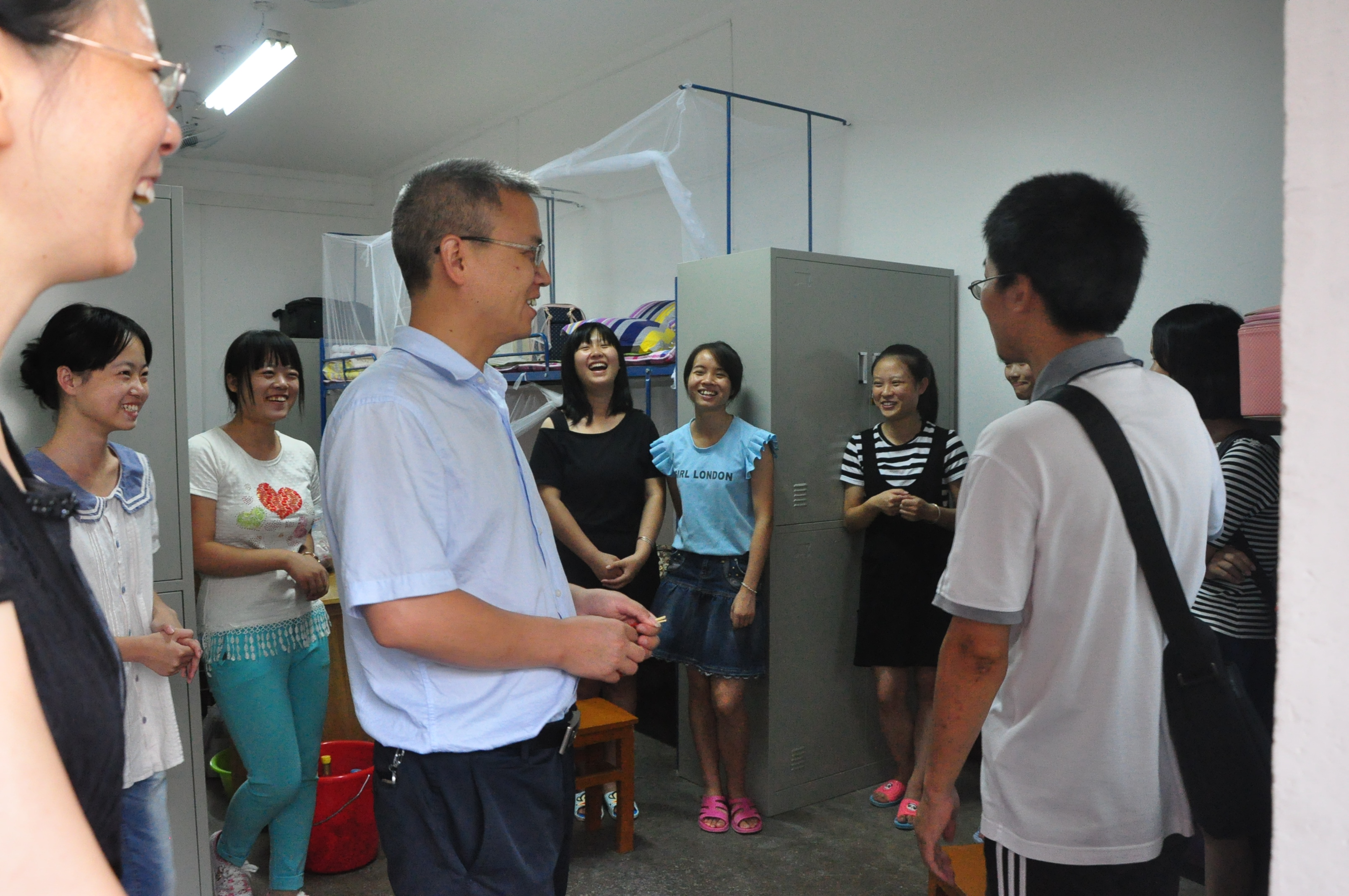 院领导和各班主任老师先从男生宿舍出发,依次走访了52栋、53栋男生宿舍以及女生全体宿舍。走访男生宿舍时,院领导对宿舍的热水供应、东西摆放、采光等一系列问题进行了详细的询问,并与许多在寝室的新生家长就一些生活适应问题进行了交流。女生宿舍相对宽敞,在对女生宿舍进行走访时,院领导详细询问的是宿舍成员情况,并嘱咐寝室成员之间要多交流,快速适应大学生活等。