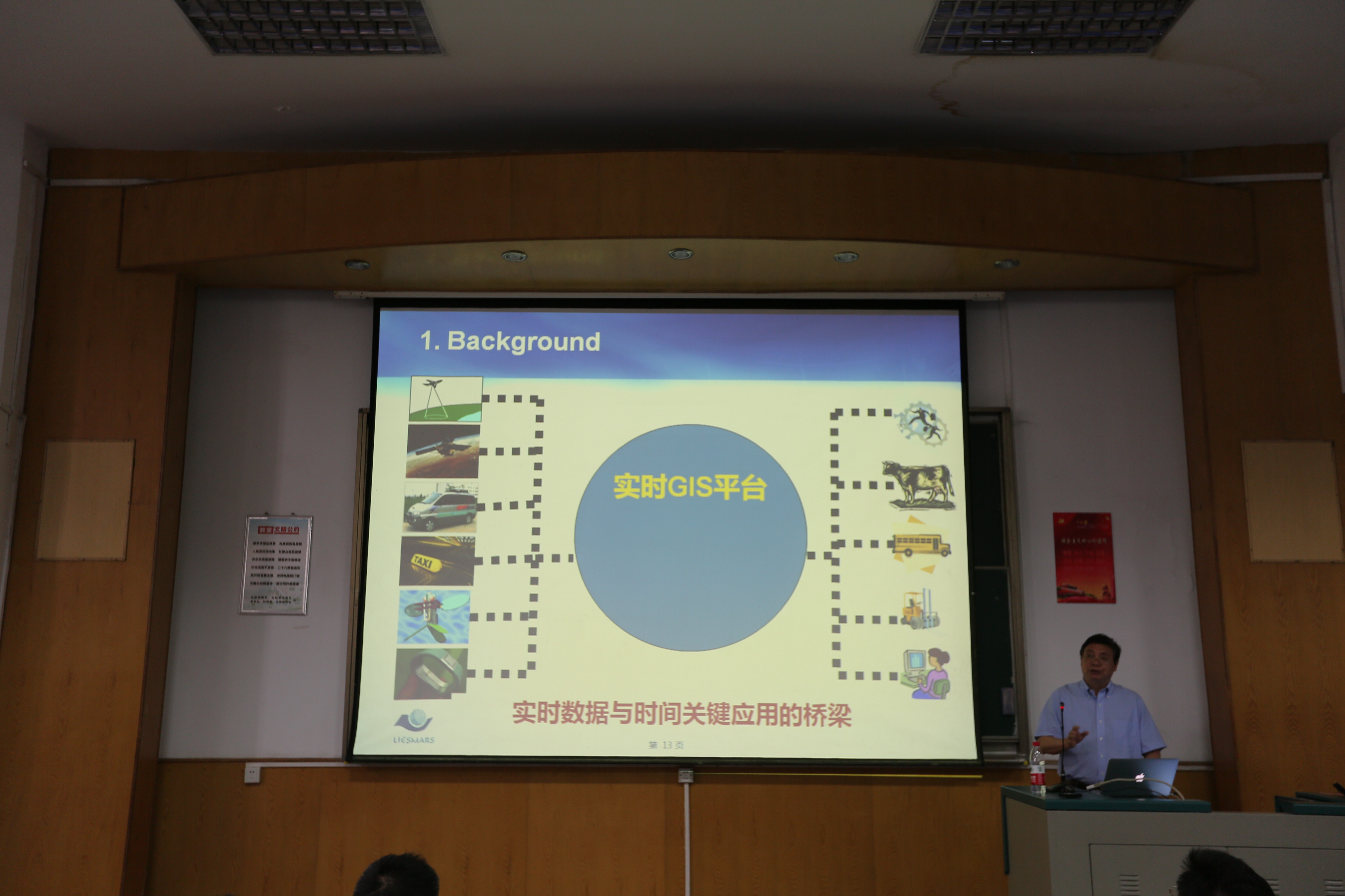 首先,龚院士浅谈了实时GIS的背景,指出实时GIS平台是实时数据与时间关键应用的桥梁,并比较了智慧城市和数字城市差异;随后,龚院士从什么是实时系统、实时GIS:应用系统、时间关键地理信息应用等几个方面介绍了实时GIS的主要特征;接着,龚院士通过介绍当今实时GIS的研究内容、传感器信息模型、时空对象概念模型以及其他相关模型向同学们展示了实时GIS的研究进展;他用已有的相关技术的实际应用情况为例介绍了实时GIS系统的广泛应用;最后,龚院士用地理信息系统向地理信息服务发展、静态地理信息向动态时空发展等六大点对此次报告进行了总结。