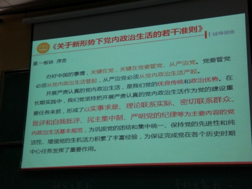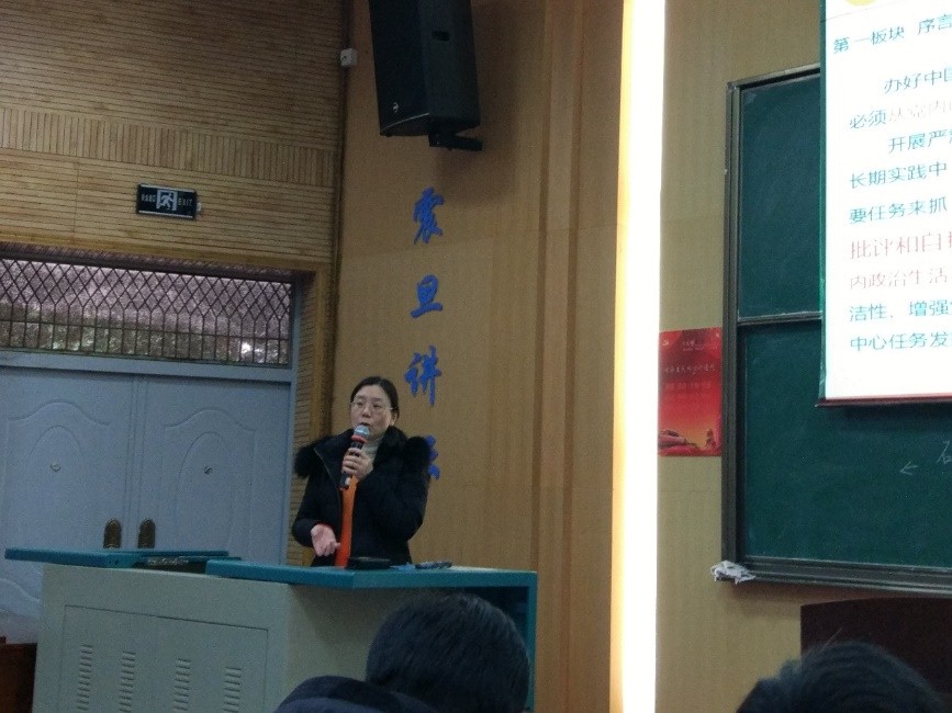 大会第四项,权威解读:学习十八届六中全会精神。信息工程学院党委书记黄菊老师分别从会议概况、深刻认识六中全会的重大意义、认真学习《新形势下党内政治生活的若干准则》三个方面,全面剖析了十八届六中全会的会议精神。黄书记建议我们:学习党的理论知识最好的方法就是读经典、读原文,课堂上知识的传授毕竟有限,希望各位同志课后继续加强学习。