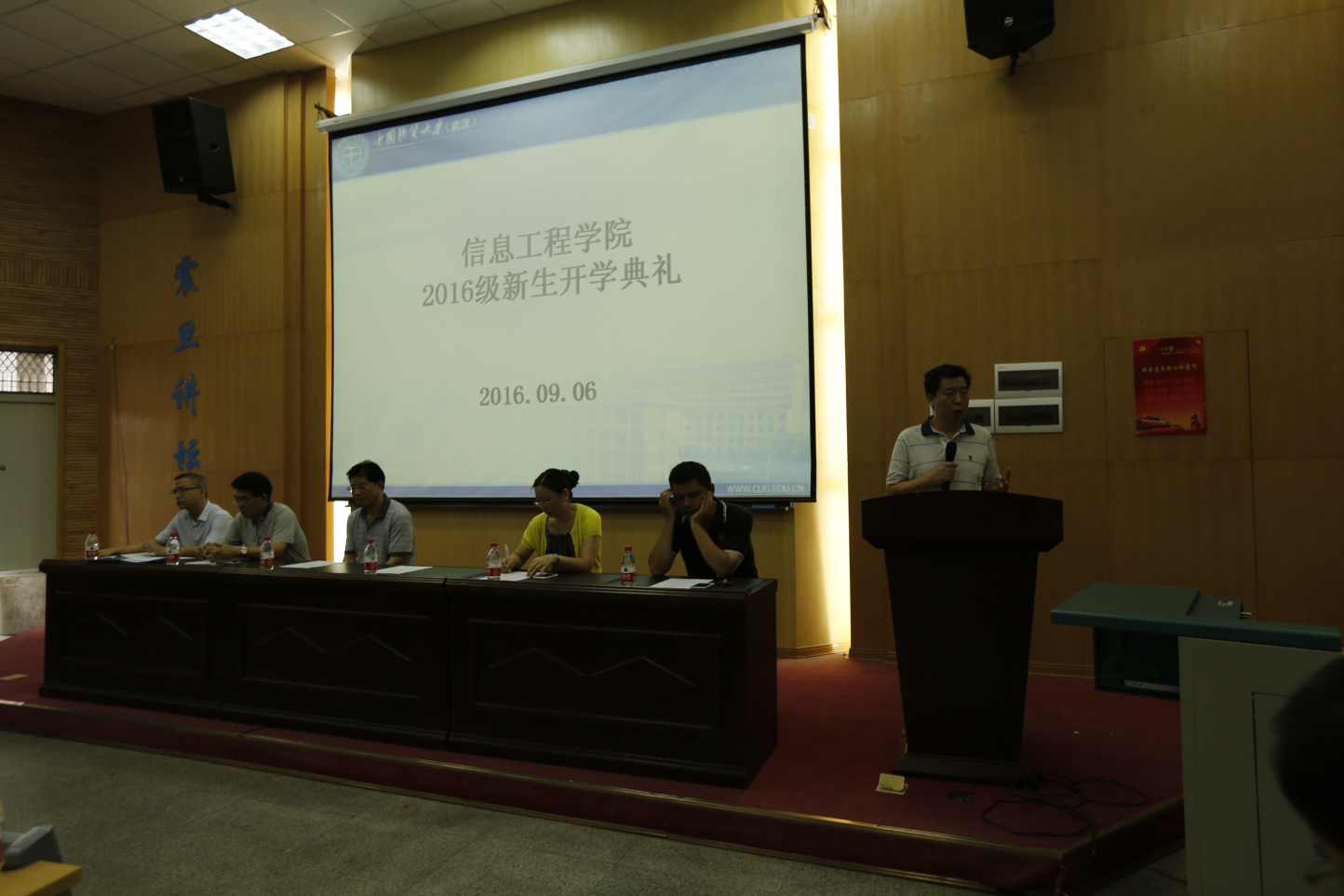 9月6日上午8点30分,2016级新生开学典礼正式开始。第一项,全体起立,奏唱国歌。第二项,信工学院院长谢忠教授致辞。