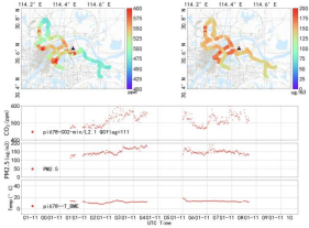 课题组自2022年起先后在地大未来城校区和南望山校区设置了基于非色散红外原理的微型化大气CO2浓度测量仪,并结合物联网技术进行全天候定位监测。通过这些仪器,课题组对武汉城市内部及边缘的CO2浓度和风速进行了持续观测,并使用搭载同类仪器的汽车进行移动观测,进一步提升了监测数据的覆盖广度和精度。研究初步结果显示,武汉市内的大气CO2浓度存在明显的昼夜变化和季节性波动,且受人为活动的影响显著,昼夜浓度呈现双峰形态。对武汉城市生态系统碳通量进行监测,将为城市碳减排政策的实施提供有力的科技支持,同时也为学院学生教学与培养提供了宝贵的实践平台。