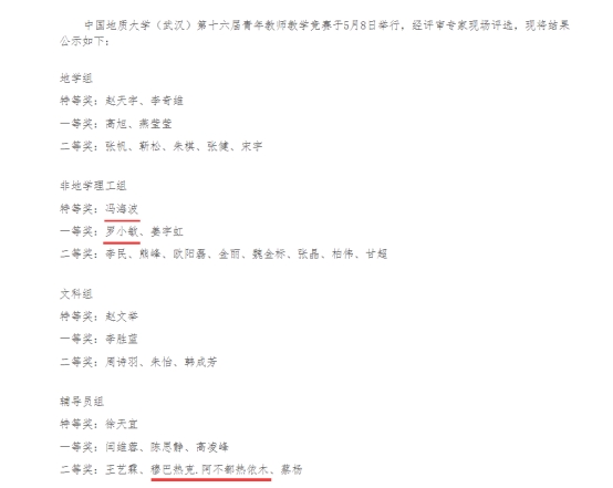 磁力狗 (武汉)第十六届青年教师教学竞赛于5月8日举行。磁力狗 地理科学系冯海波老师、测绘遥感系罗小敏老师在非地学理工组分别获得特等奖、一等奖,辅导员穆巴热克.阿不都热依木老师荣获辅导员组二等奖。