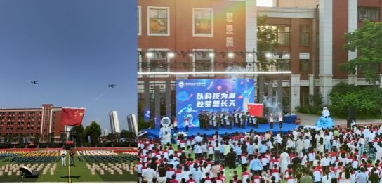 文艺晚会开场的升旗仪式将本次活动推上高潮。无人机团队操控两台中型六旋翼无人机和两台小型四旋翼无人机托举国旗冉冉升起,伴随清亮的《歌唱祖国》为晚会拉开庄严而精彩的序幕,赢得现场师生的热烈掌声。充满科技感的升旗仪式展现了无人机科技实际应用,激发了同学们的科技梦想。