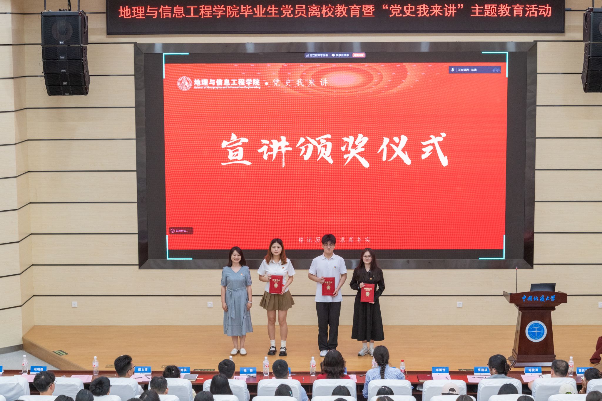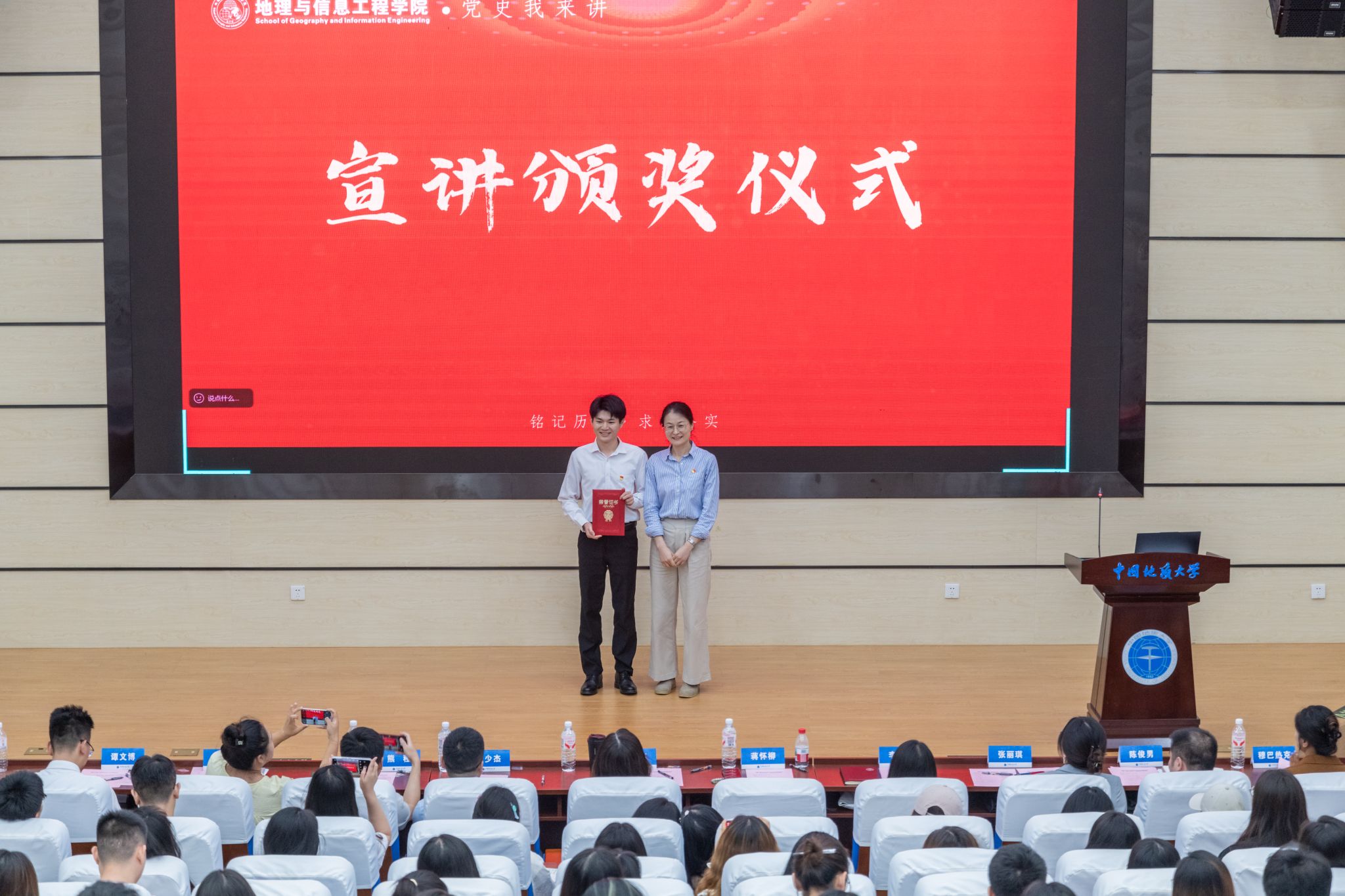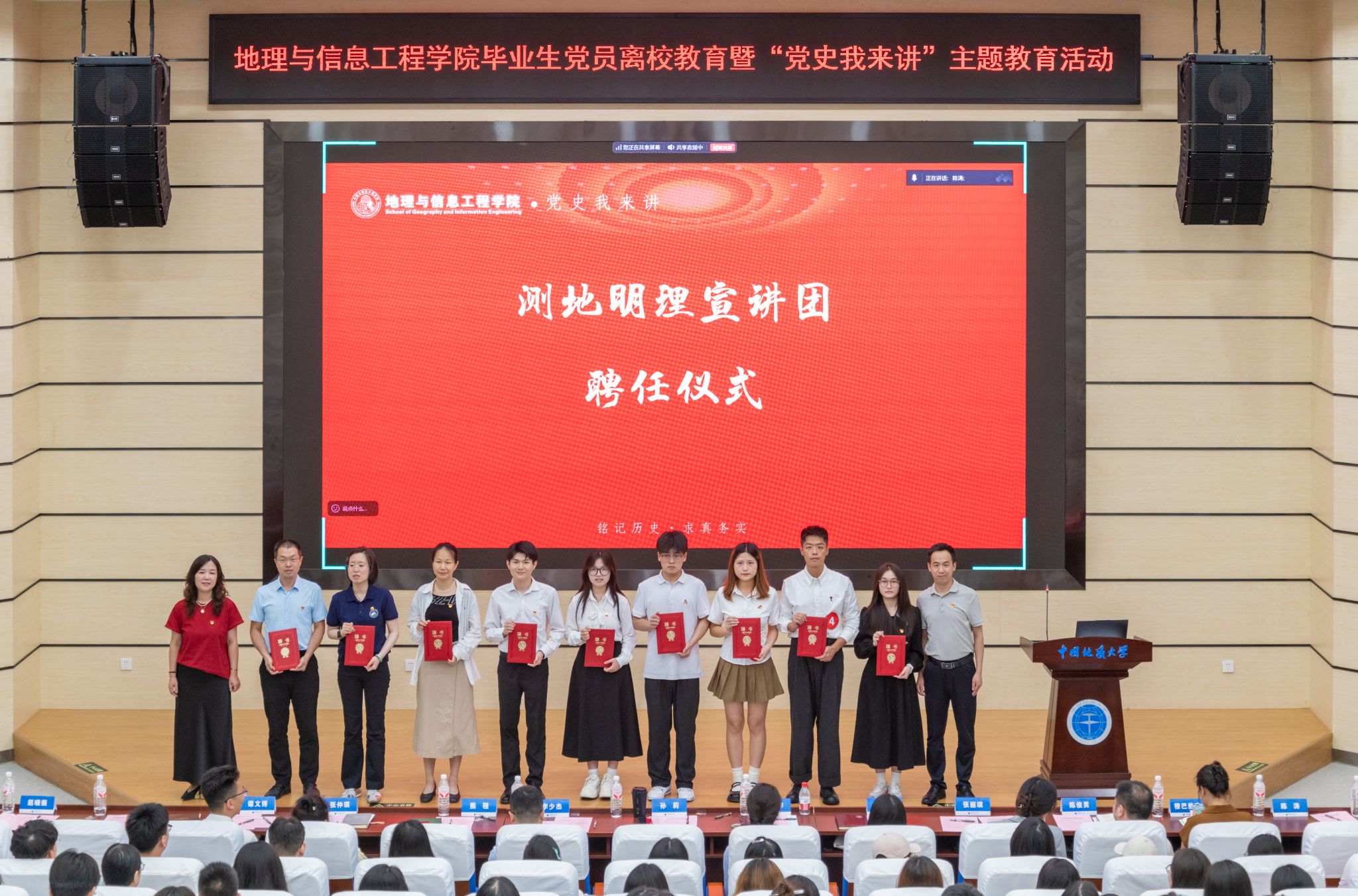 孙莉、熊程为10位参加宣讲活动的师生党员颁发测地明理宣讲团聘书