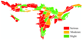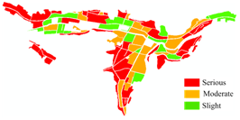 本文提出的建筑物损毁评估方法主要包含三个步骤:首先,将基于极化SAR数据估算的统计模型的纹理参数取对数作为新的纹理特征来描述建筑物区的均匀程度。其次,基于提取的纹理特征选取阈值区分倒塌建筑物和完好建筑物。最后,计算建筑物区块内倒塌建筑物所占的比例,将建筑区的划分为轻度损毁、中度损毁和重度损毁三个等级,完成建筑物的损毁评估。此外,本文还还分析了极化SAR数据不同统计模型和不同纹理参数估算方法对建筑物损毁评估的应用能力。