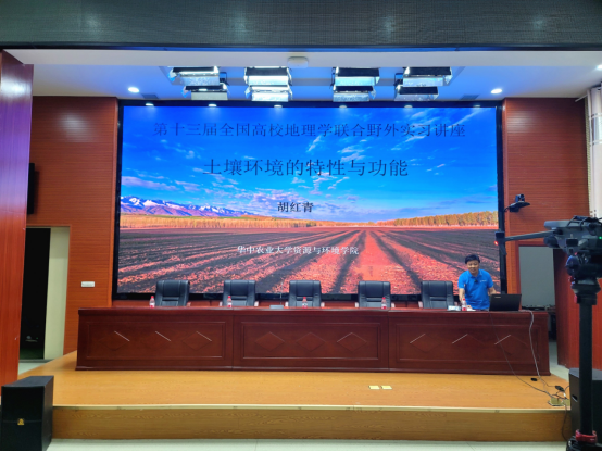 (武汉)陈旭教授主持。神农架林区教育局副局长马毅致辞,介绍神农架林区概况,并对实习师生的到来表示欢迎。华中农业大学胡红青教授应邀作题为“土壤环境的特性与功能”的报告,由土壤的定义入题,围绕土壤用途、土壤环境特征、土壤环境行为与功能属性、土壤环境与人类环境关系、土壤与健康、土壤与全球变化、人类活动对土壤的影响等内容展开论述,带领实习师生探索土壤的无穷奥秘。报告后,同学们就神农架地区土壤呼吸对气候变暖的影响、湖北省土壤重金属污染分布特征、土壤碳库估算的挑战性等问题与胡老师展开充分交流与讨论。