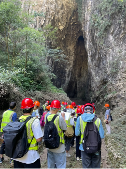 顺小径向山深处探寻,同学们来到和尚洞和高家溪石板桥旁的河岸处。和尚洞,刀劈斧削,洞口宽大,呈三角状,高约40米,宽约20米,深半百米。洞壁发育有岩溶裂隙,更可见石钟乳悬于洞中。喀斯特地貌的鬼斧神工将和尚洞这宽大呈三角形的巨大洞口与越向里越神秘的无限空间延伸带到了同学们眼前,不断扩展着大家的想象力。吕建军老师和林伟华老师为同学们讲解着和尚洞的形状形态及其发育条件与成因,同学们赞叹于喀斯特地貌的瑰丽,也赞叹于其奥妙的形成条件。