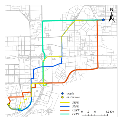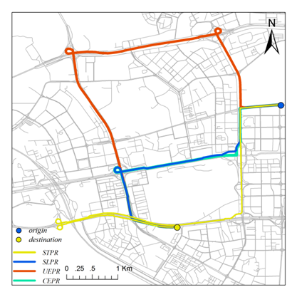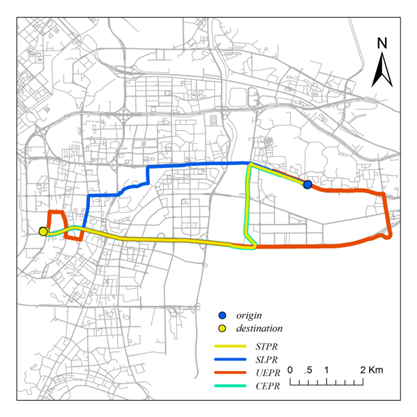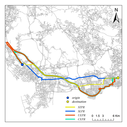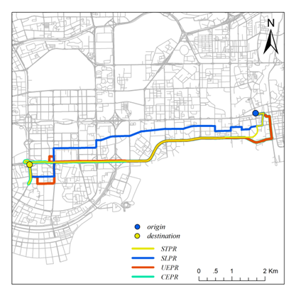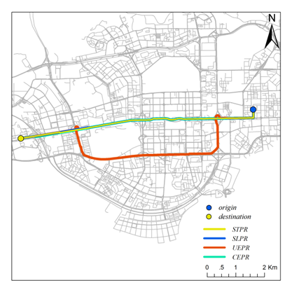 (CEPRrepresents constrained experience-based planning routes computed by our model,UEPRrepresents uncontrained experience-based planning routes, SLPR denotes routesidentified using the shortest length path algorithm; STPR denotes routesidentified using the shortest time path algorithm. )