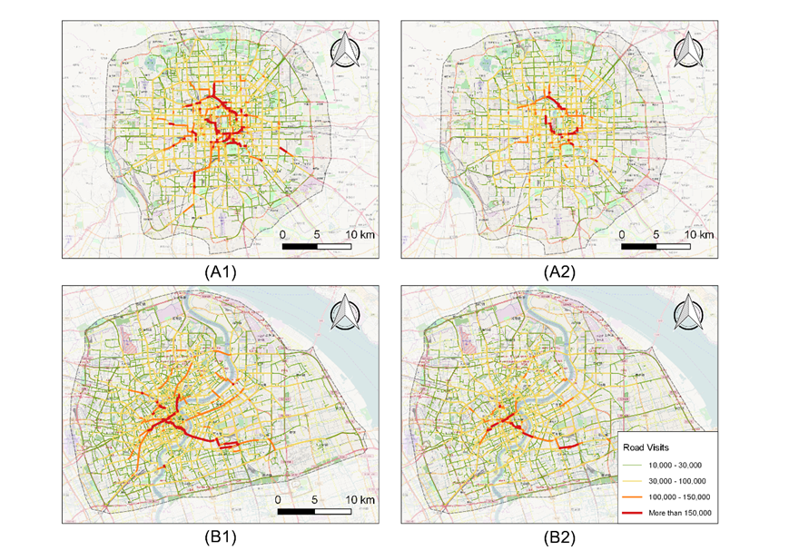 图1小区开放前后路网经过频次:(A1)北京实施前,(A2)北京实施后,(B1)上海实施前,(B2)上海实施后