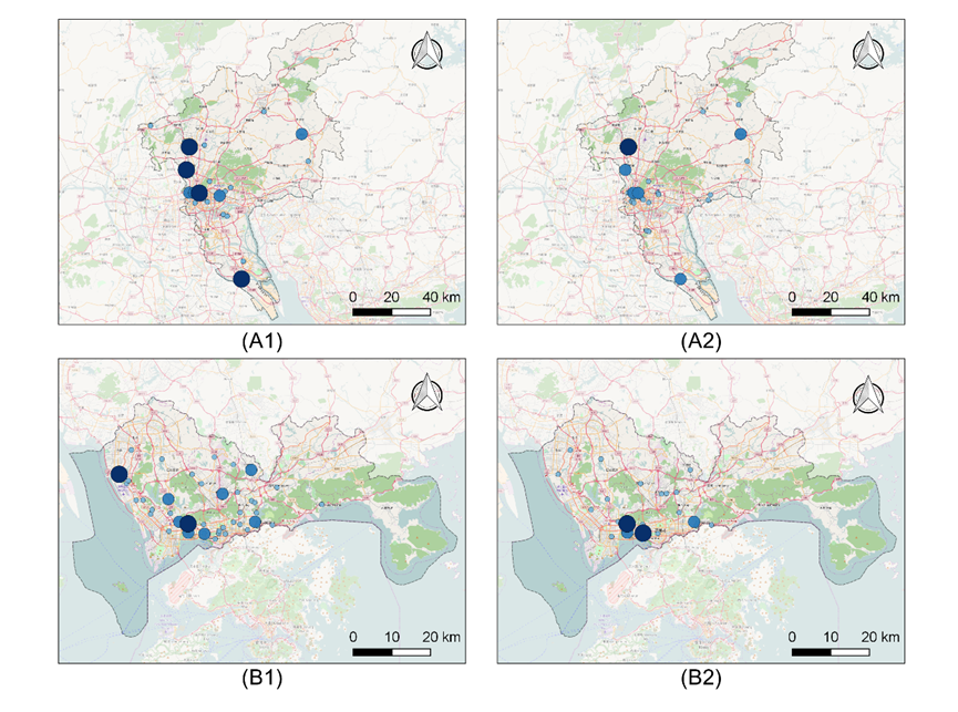 图4 小区开放交通拥堵节点的变化:(A1)广州实施前,(A2)广州实施后,(B1)深圳实施前,(B2)深圳实施后