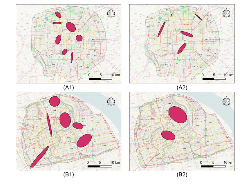 图5 小区开放交通拥堵主要区域的变化:(A1)北京实施前,(A2)北京实施后,(B1)上海实施前,(B2)上海实施后