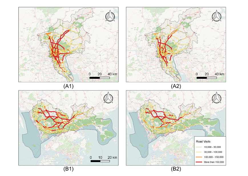 图2 小区开放前后路网经过频次:(A1)广州实施前,(A2)广州实施后,(B1)深圳实施前,(B2)深圳实施后