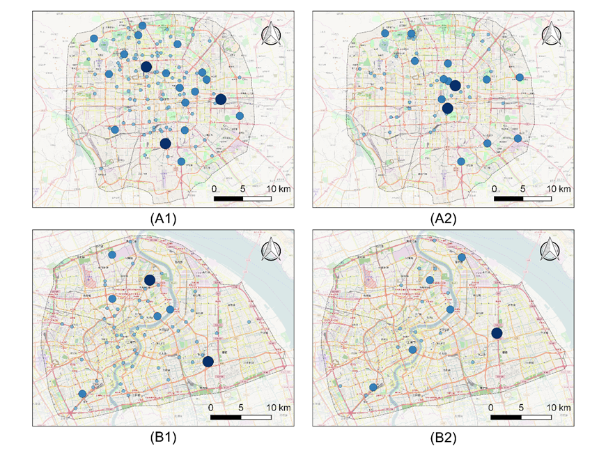 图3 小区开放交通拥堵节点的变化:(A1)北京实施前,(A2)北京实施后,(B1)上海实施前,(B2)上海实施后