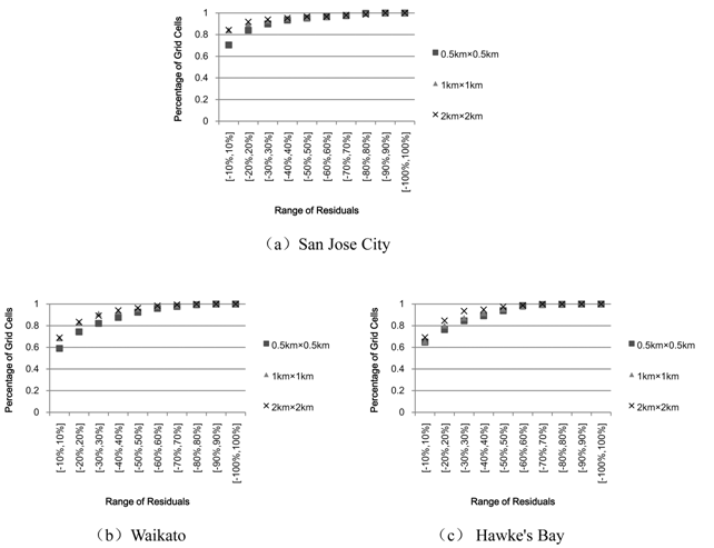 (3)实验不同大小的地理单元(如0.5×0.5和2×2平方公里)后发现:地理单位不易设置过小(如小于0.3或0.4平方公里),否则,估计结果的残差可能变大(图4)。