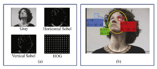 输入图片,随机选择图片块,提取每个图像块的复合结构特征:相关纹理特征和几何距离图。其中复合结构特征分别是灰度值、Sobel边缘特征(水平和垂直方向)、HOG特征;几何距离特征图即图片块中心到头部轮廓的最近边界(距离为负表示该块在头部区域外边,距离为正表示该块在头部区域内部)。