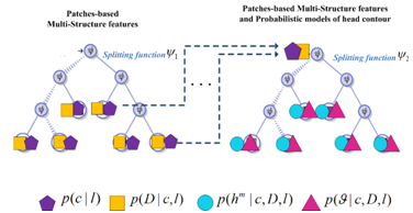 通过随机森林训练复合结构森林,构建头部轮廓回归子森林,对图像特征子块首先进行头部块分类,获得人脸区域的图像子块,再通过mean-shift聚类得到头部轮廓点,得到头部轮廓 。混合森林的叶子节点为多概率模型,包括图像子块的分类概率,头部轮廓的偏移距离和头部姿态分类概率,如图3。
