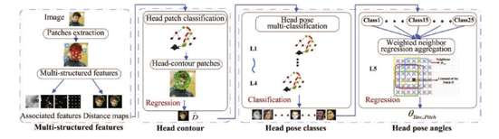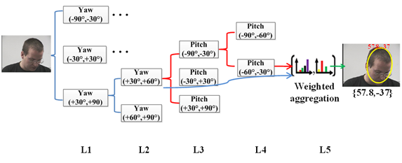 根据头部轮廓进行头部姿势多分类,采用由粗到细的分层策略(L1-L4层),先估计水平姿态,在水平姿态的条件下,再估计竖直头部姿态,获得25个(yaw5类*pitch5类)头部姿势类。最后,对分类的25个姿势类进行加权邻域回归聚合(L5层)计算头部姿势角度。