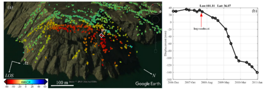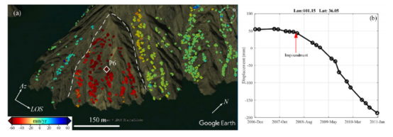 InSAR数据集由于全天时全天候、覆盖范围广和对地表形变敏感等特点,越来越受到认可,在滑坡识别监测中发挥着越来越重要的作用。基于此,我们通过收集L波段ALOS PALSAR、C波段Sentinel-1数据以及X波段TerraSAR-X数据等,对黄河上游的库区稳定性进行识别监测。结果显示在黄河上游的龙羊峡至李家峡水电站范围内发现滑坡一百余处。大多数滑坡以线性位移速率移动。在降雨量最集中的夏季和秋季,在一些滑坡上观察到明显加速度。其中,拉西瓦水电站蓄水触发了部分滑坡,示例如图1所示,蓄水后滑坡明显出现加速趋势。2015年后,拉西瓦水电站达到最大蓄水位,水位稳定后,上述两处滑坡变形受降雨控制。拉西瓦水电站的最初蓄水可能引发或加速了黄河上游河岸的斜坡移动。