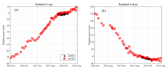 图2. GPS量测结果比较与InSAR结果比较