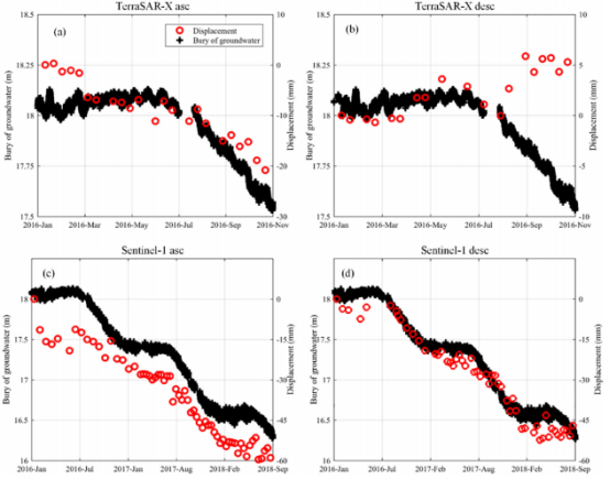 图3展示了焦家滑坡群附近的钻孔所记录的地下水埋深数据与InSAR结果的对比图。所谓地下水埋深是指地面高度与地下水位之差。一月至三月之间的位移可能由冻融现象所引起。从七月中旬开始的秋季集中灌溉引起地下水位急剧上涨、钻孔测量值急剧下降,滑坡位移同时也显著加快。