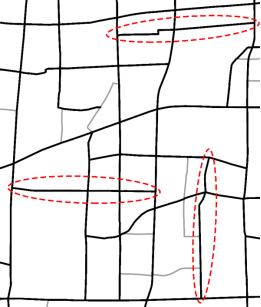 基于以上思想,接下来的问题便是如何量测弧段间的功能联系。本文通过引入交通大数据的出租车轨迹流,判断弧段间是否存在显著的交通流;若存在,则认为弧段间具有较强的功能联系(图1),在地图综合过程中,需同时保留或删除相应弧段,以最大程度还原真实场景下人们的路径选择(图2)。