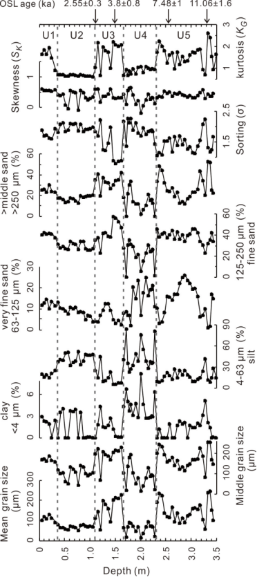 在此基础上,对该剖面进行了高分辨率的粒度测量,风力的强度和干旱程度决定了粒度的大小,一般粗粒含量高,代表了干旱的气候。粒度分析结果表明,~6.5 ka之前和~4.3-2.6 ka气候比较干旱,~6.5-4.3 ka气候最湿润,~2.6 ka以来气候较湿润。研究结果与中亚地区前人的研究成果一致,即中亚内陆区在早全新世较干旱,中全新世最为湿润,晚全新世较为湿润,其中~4.3-2.6 ka的极度干旱事件在全球各地均有记录,这一时期也是古代文明更替的重要时期,说明极端气候变化对人类社会的演替有重要影响。