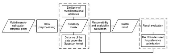 本文综合考虑时空数据不同尺度下的多维属性,应用高斯核变换解决线性不可分的问题。针对AP聚类算法的参数选择,提出一种自适应参数的设置方法,减少了人工定义参数的局限性。最后,利用北京出租车轨迹数据进行实验,验证MDST-AP算法的有效性。图1为MDST-AP算法流程图。