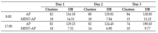 本研究中随机选择三个工作日早、晚高峰轨迹点数据进行实验,对比AP和MDST-AP算法的聚类结果。根据表1可知,AP聚类结果中的类别数目和DB值是MDST-AP算法的约10倍和5倍。在分析大规模的时空数据时,如果聚类数目过大,不利于拥塞检测,人工判断的工作量会增加,导致相当大的数据冗余。通过GPS数据聚类实验,验证了MDST-AP算法的有效性。