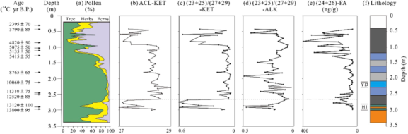 主要发现湖沼沉积序列中的脂肪酮以长链的C29为主,通过对比脂肪酮和正构烷烃、脂肪酸的分布模式和在沉积序列中较为相似的变化趋势,确定了脂肪酮来源于正构烷烃和脂肪酸的微生物氧化。在沉积序列中,脂肪酮的平均碳链长度ACL、中链与长链比值(C23+C25)/(C27+C29)与木本、草本和蕨类植物的相对丰度呈现一致的变化趋势,表明脂肪酮具有追踪古植被和古气候变化的潜力。脂肪酮的碳优势指数CPI随岩性而变化,在泥炭沉积中CPI值较高,在湖泊沉积中CPI值较低,而古水文条件的变化对于泥炭和湖泊的交替演化具有重要影响,这表明脂肪酮CPI指数具有反映古水文条件的潜力。
