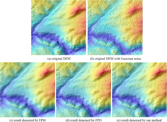 (2) 将前一步骤的结构特征曲面作为输入,原DEM曲面作为引导曲面,实现引导滤波同时在空间域和值域的窗口操作,以此获得DEM结构曲面的形态特征平滑。比较一般滤波,引导滤波可额外添加引导曲面作为平滑约束条件,即,使处于平坦区域的位置被加以较大权重,进而获得较显著的平滑效果,而使处于结构边界两侧的位置被加以较小权重,进而获得较弱的平滑效果;通过以上自适应的权重方式,可实现边界特征保持的曲面平滑(图2)。