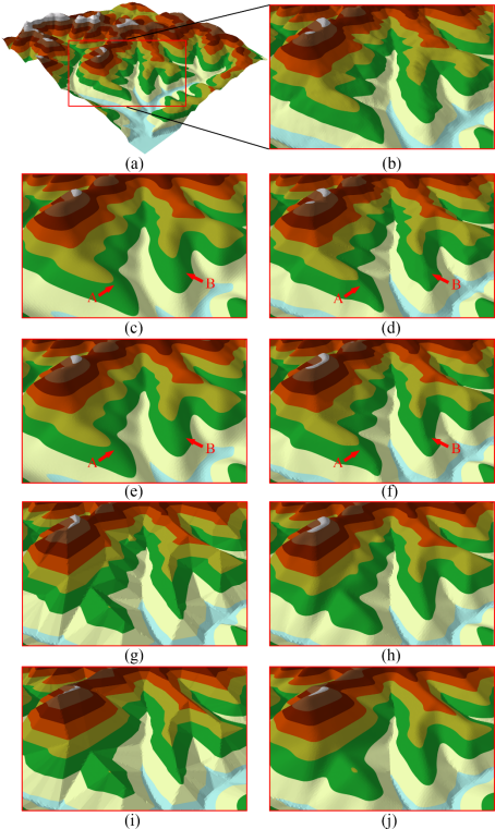 图3 不同方法结果的对比:原始数据(a);原始数据的局部放大图(b);传统滤波方法(c)和本文方法(d)的小尺度化简结果对比(RMSE = 5);传统滤波方法(e)和本文方法(f)的大尺度化简结果对比(RMSE = 6);传统综合方法(g)和本文方法(h)的小尺度化简结果对比(maximum Z error = 30);传统综合方法(i)和本文方法(j)的大尺度化简结果对比(maximum Z error = 50)。
