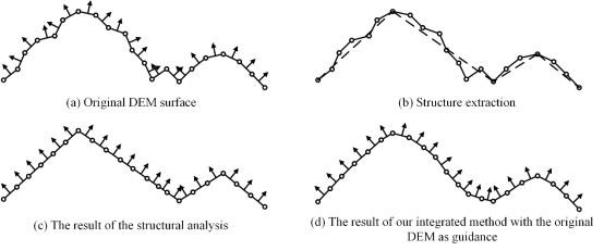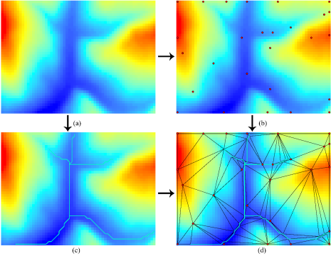 图1 DEM结构分析方法:(a)源数据;(b)提取地形结构点;(c)提取地形结构线,如水系网;(d)基于约束三角网的DEM结构生成。