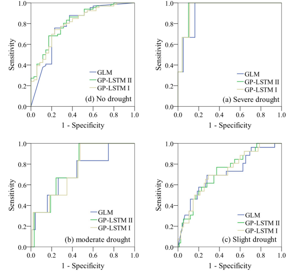 根据不同干旱等级的预报决策阈值,计算预报的命中率与误报率,对干旱等级预报进行评价,如图3所示。图3分别为严重干旱、中度干旱、轻度干旱和无干旱的ROC曲线。蓝色、绿色和黄色曲线分别代表了GLM、GPLSTM-S1和GPLSTM-S2预测的ROCs。ROC曲线下面积(AUC)代表干旱等级预测的能力,曲线下面积越大,分类准确率越高。从图6中可以看出,三种模式的预测能够很好地识别严重干旱的发生和不发生。GPLSTM-S1和GPLSTM-S2的AUC高于GLM。对于每一类干旱,根据AUC最大,值的次数定义最佳预报模型GPLSTM-S2被认为是获得干旱等级预报的最佳模型。