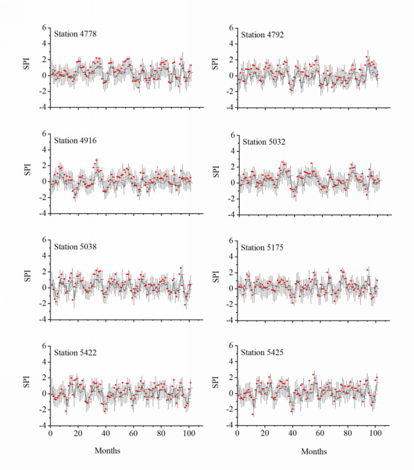 本文还为干旱预报建立了三种标杆模型进行对比,自回归移动平均、广义线性回归和人工神经网络。根据预测均值和预测区间,采用四种验证方法对预测能力进行了评价。结果表明,改进后的预报模型能较好地预报干旱指数和不确定性信息,并验证了内部聚集策略在三江源区干旱概率预报中的优越性(图2)。