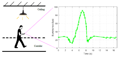 (用户在经过LED下方时,手机里的光线传感器的读数变化)