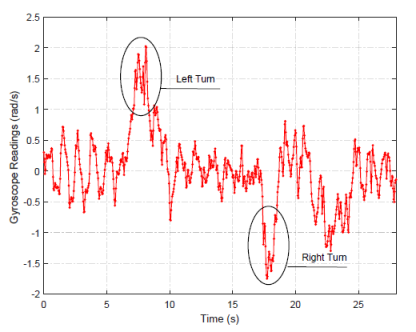 (用户在经过拐角时,手机里陀螺仪的读数变化)