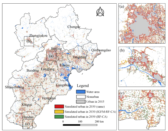 图6 2030年京津冀城市扩张模拟:红色栅格为IGFM-RF-CA与RF-CA模拟结果一致的区域;黄色和绿色栅格分别表示IGFM-RF-CA和RF-CA模拟结果不一致的区域