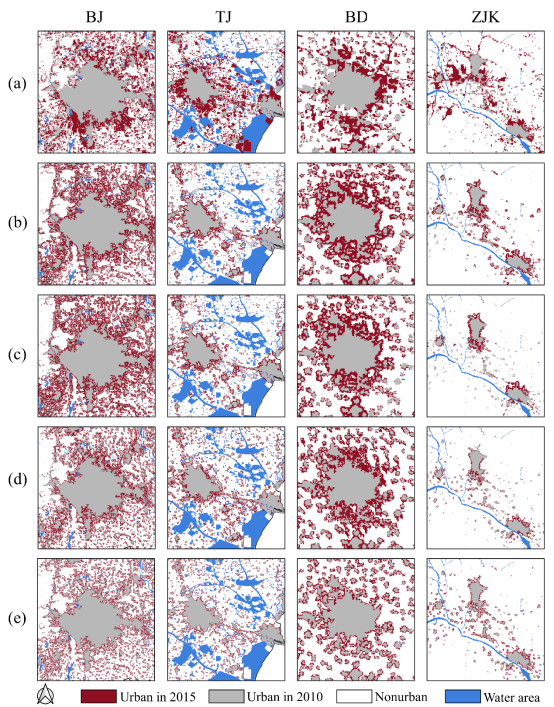 图3 2000-2015年京津冀城市群城市扩张模拟结果和真实情况对比:(a)2015年现状;(b)IGFM-RF-CA模拟结果;(c)GFM-RF-CA模拟结果;(d)GFM-LR-CA模拟结果;(e)RF-CA模型模拟结果