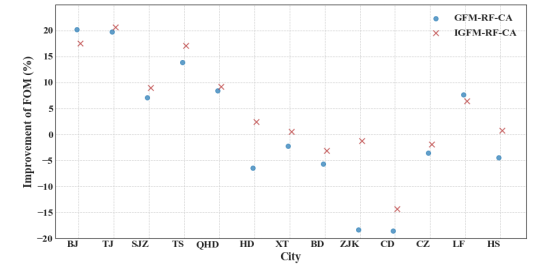 图5 GFM-RF-CA和IGFM-RF-CA相较于RF-CA的模拟精度(FoM)提升程度