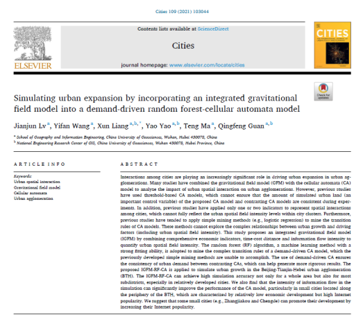 Lv, J., Wang, Y., Liang, X. *, Yao, Y., Ma, T., & Guan, Q. (2021). Simulating urban expansion by incorporating an integrated gravitational field model into a demand-driven random forest-cellular automata model. Cities, 109, 103044, DOI: //doi.org/10.1016/j.cities.2020.103044.
