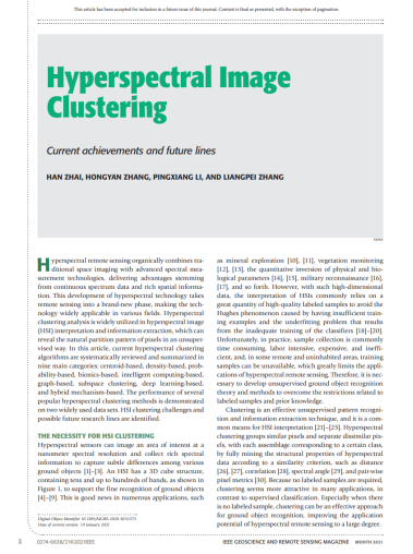 H. Zhai, H. Zhang*, P. Li, L. Zhang (2021). Hyperspectral Image Clustering: Current Achievements and Future Lines. IEEE Geoscience and Remote Sensing Magzine. DOI: 10.1109/MGRS.2020.3032575. (SCI, IF: 13.000, 中科院1区,Top期刊,JCR Q1, 地大T2)