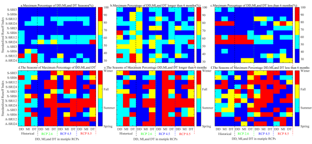 图6 总干旱历时大于和小于6个月干旱事件的干旱发展、最大干旱强度和干旱终止出现频率最高的季节