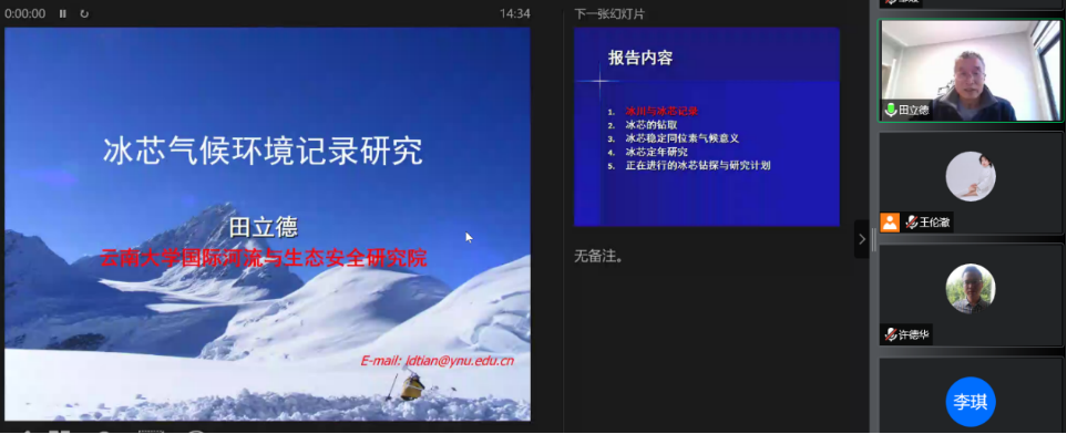 (武汉)第115期名家论坛暨校庆七十周年学术交流会,以线上形式作题为“青藏高原冰芯气候环境记录研究”的学术报告,受到师生的热烈欢迎。报告由王伦澈教授主持,线上与会人数共计逾100人。